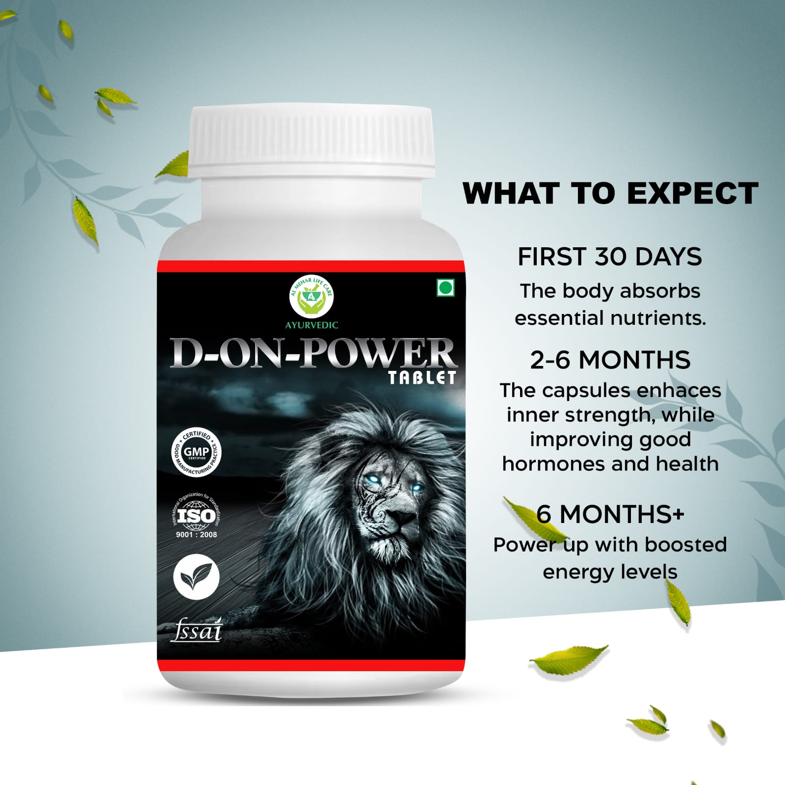 D-ON-POWER Tablet is a premium Ayurvedic supplement formulated to naturally enhance inner strength, vitality, and energy levels. Made with certified GMP and ISO standards, this herbal solution is designed for progressive and long-term health benefits: